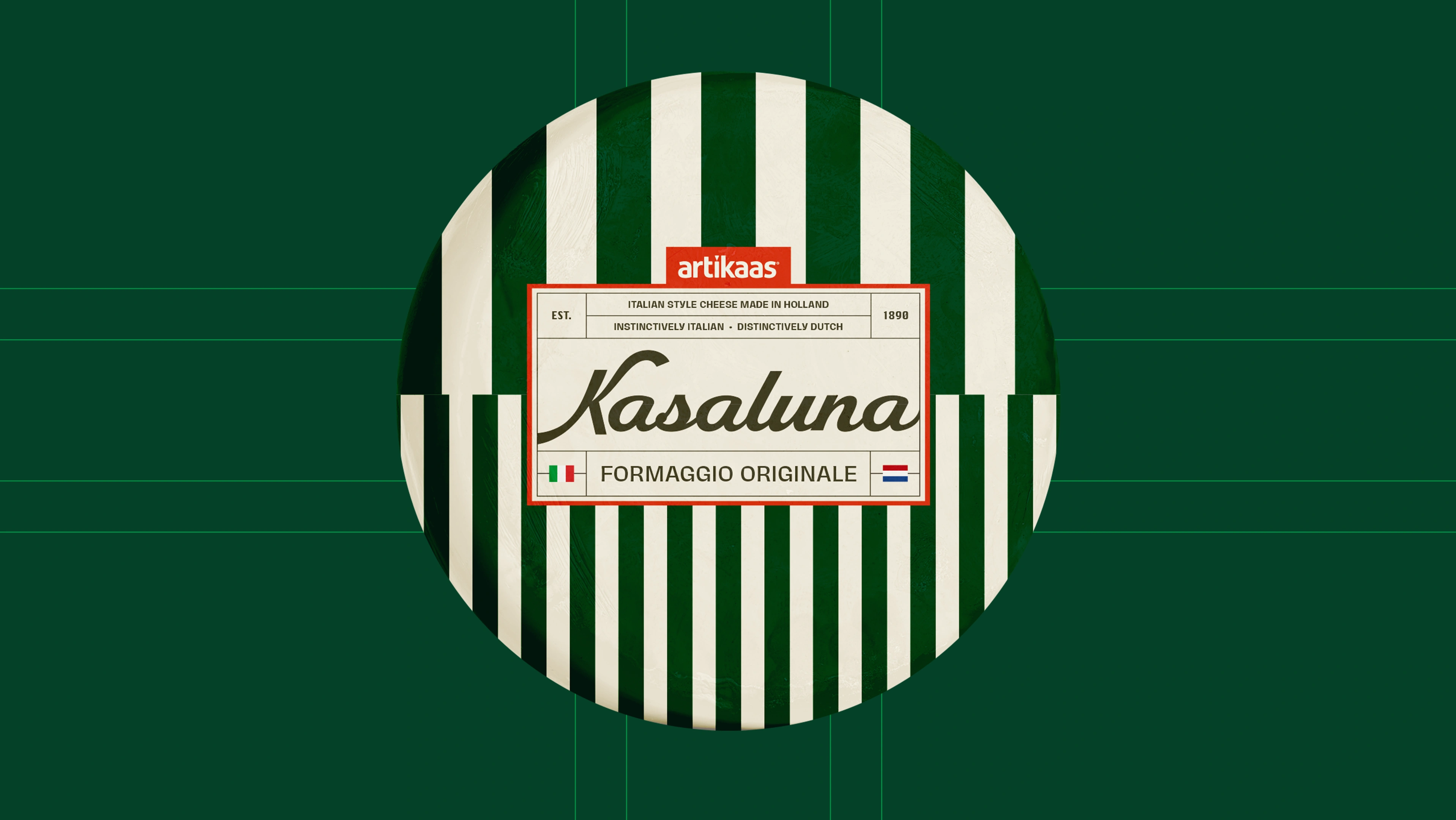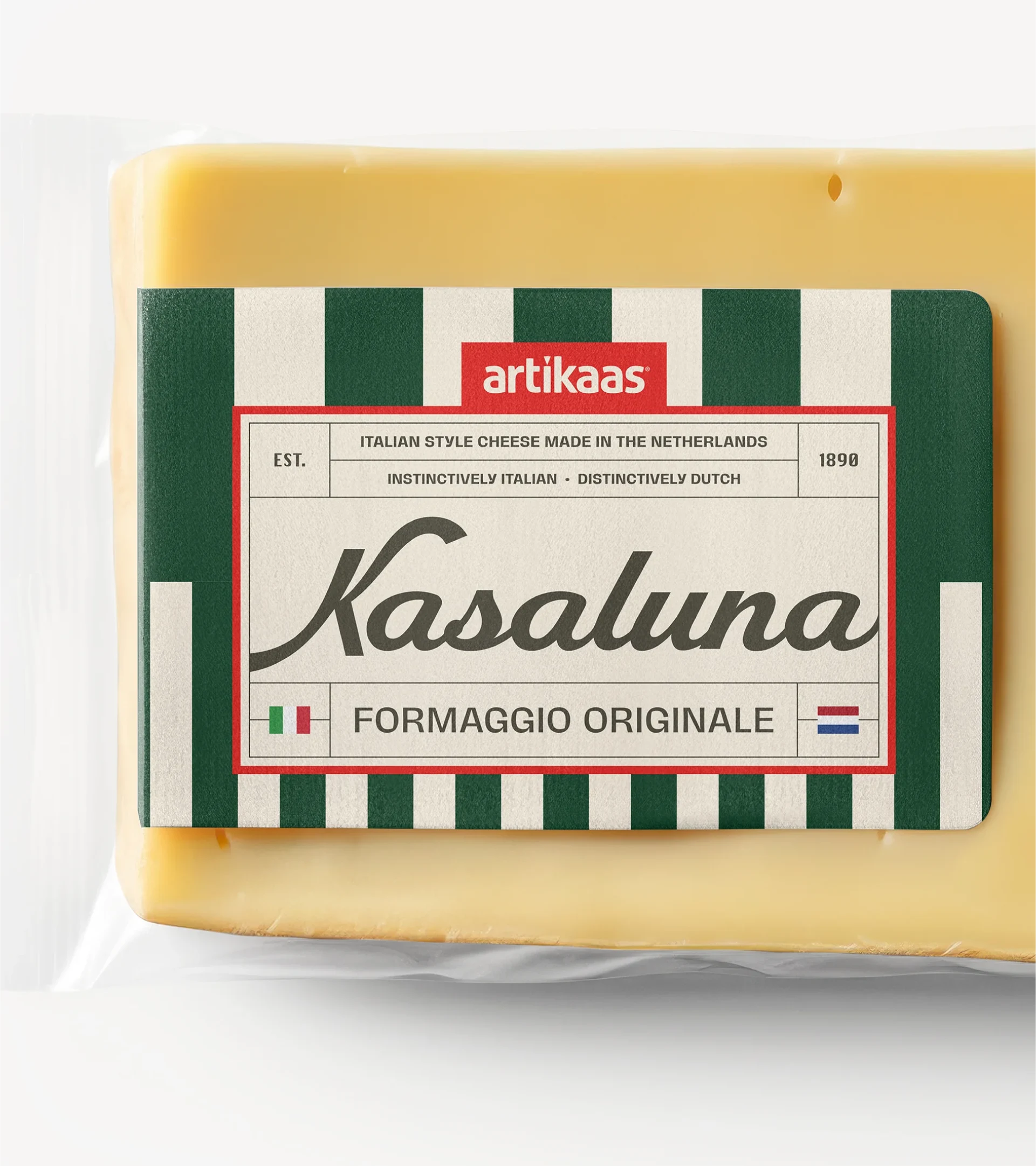 The playful and romantic name "Kasaluna" reflects the cheese's easygoing and versatile character. It also borrows from both Dutch and Italian--"kaas" means "cheese" in Dutch and "luna" means "moon" in Italian. Romantic moonlit charcuterie, anyone? The packaging design uses Italian flag colors with modern and custom-tailored typefaces for an updated, yet timeless, feel.